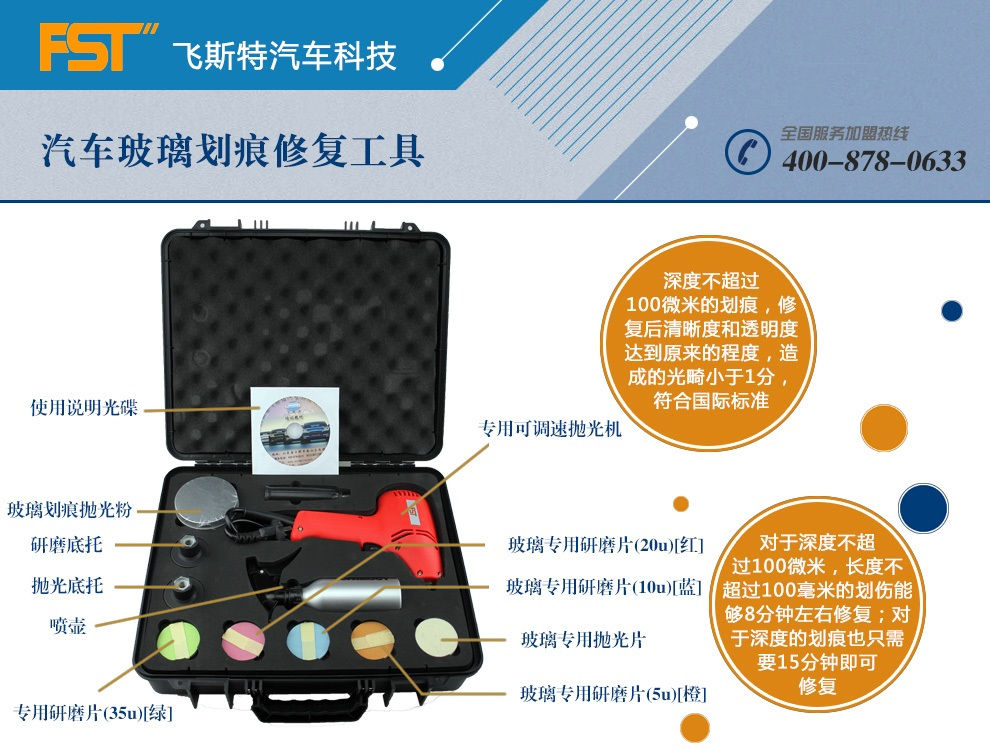 玻璃劃痕修復(fù)工具采用的研磨片為世界先進(jìn)的微觀三維結(jié)構(gòu)(金字塔型)拋光材料來消除玻璃劃痕,開創(chuàng)的錐形拋光方式,從而產(chǎn)生一個(gè)金字塔形的切割過程。通常只需要15分鐘左右,即可完全修復(fù)其原有的透明度與清晰度。